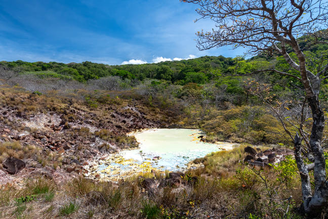 The Las Pailas sector spectacularly shows the power of the Rincon de la Vieja volcano, the most active and largest volcano in Guanacaste, Costa Rica. Steam and sulfur come from natural fumaroles of the yellow and rusty soil. Witness clay pails in various shades of brown with boiling volcanic water, fine gray volcanic mud bubbles and explosions in large pails. This volcano is like no other in Costa Rica.
