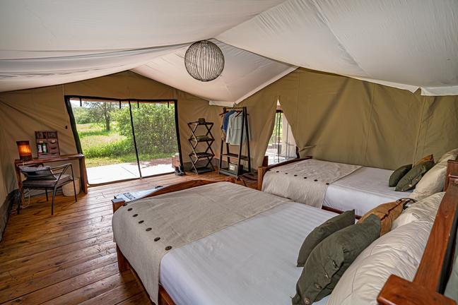 Each generously sized two-bedroom en-suite tent offers everything your family needs for an extraordinary migration experience. Comfortable double beds with cozy warm duvets in both bedrooms provide perfect rest for parents and children after exhilarating days tracking wildebeest herds across the endless Ndutu plains. Your private family outside deck becomes your personal viewing platform for the greatest wildlife show on Earth.