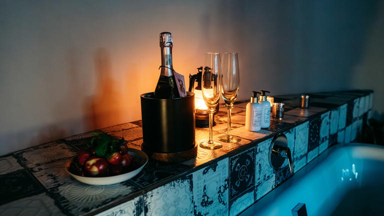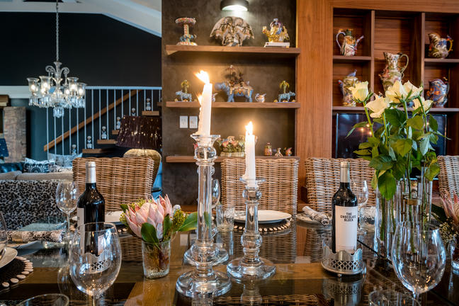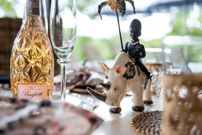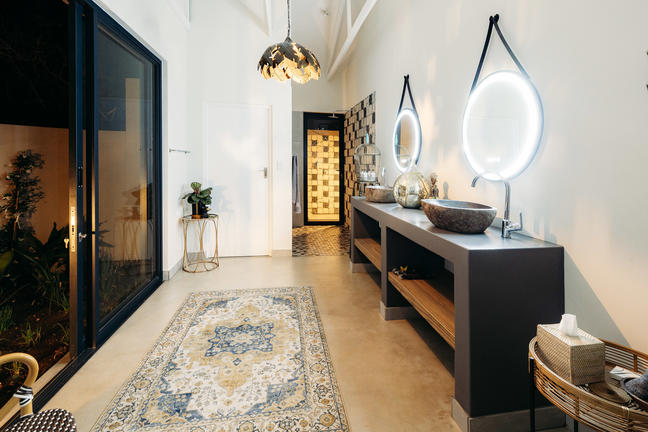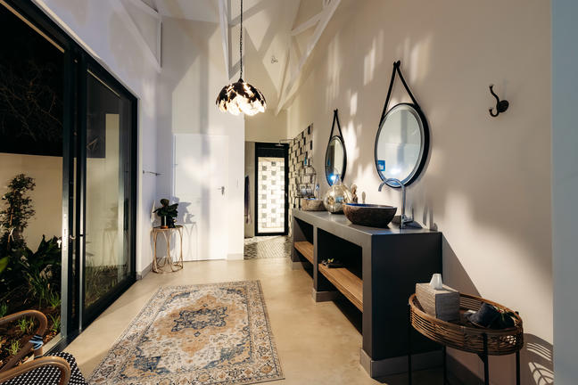 Glamourös ist das Wort, das die Deluxe-Suiten am besten beschreibt. Beide verfügen über ein Himmelbett und befinden sich auf einer Anhöhe über dem Buschland und bieten eine hervorragende Aussicht von einer privaten Terrasse aus. Eine große, marokkanisch inspirierte Außendusche ist ebenfalls ein Hauptmerkmal dieser Suite mit Blick auf die majestätischen Drakensberge. Im Inneren ziert ein wunderschönes, blau gefärbtes Perserglas den Boden unter Ihren Füßen. Der perlenbesetzte Kronleuchter bringt Licht und Eleganz in das Badezimmer, das mit einer freistehenden Steinbadewanne, einem Doppelwaschbecken, einer ebenerdigen Dusche und dekorativen Details ausgestattet ist.