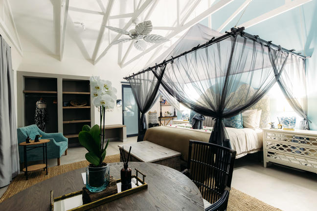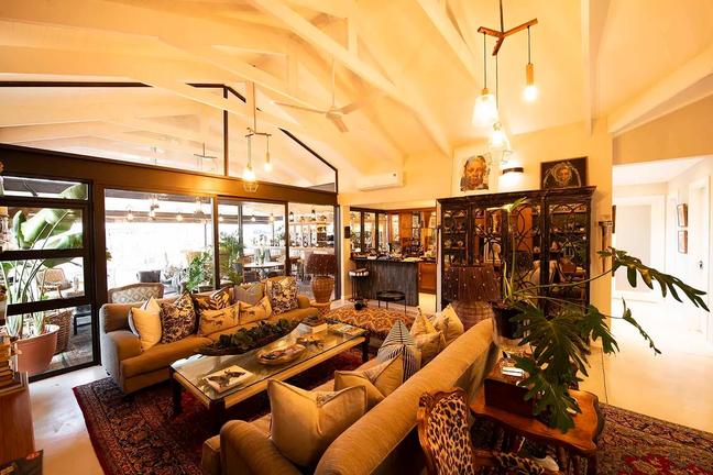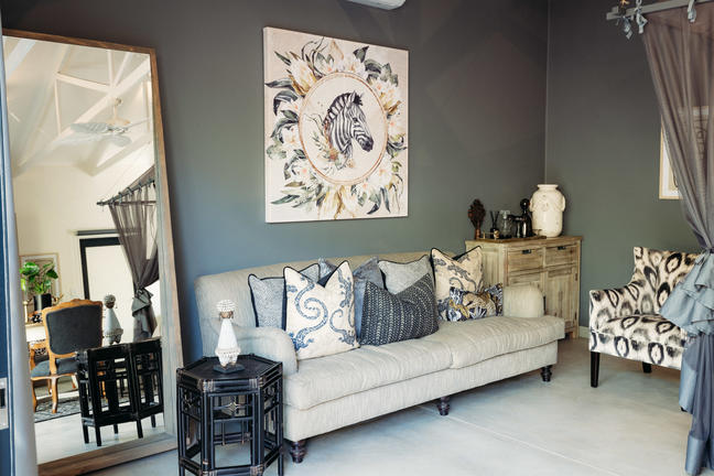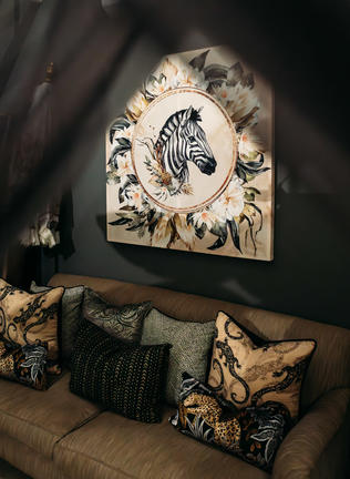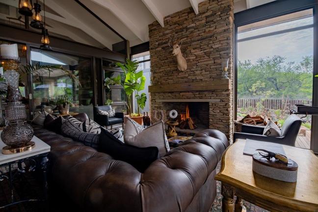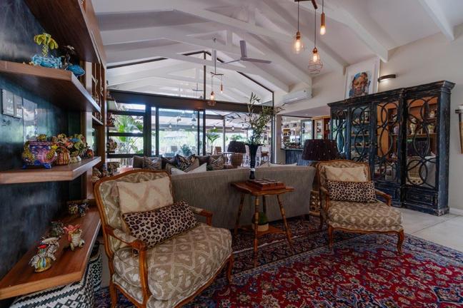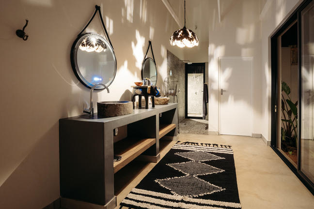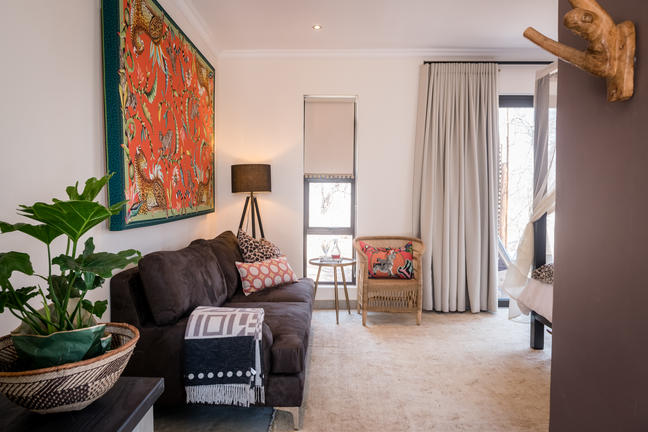 Benannt nach den stacheligen Stachelschwein, die oft von der Terrasse nach Einbruch der Dunkelheit gesehen werden, ist dieses Zimmer im Erdgeschoss und ist eines der geräumigsten mit 85 QM in der Größe und die abgeschiedenste aller Suiten. Elegante Akzente sind ein Daniel Novella Stück, persische Teppiche, Melvin & Moon Stühle, ein großes Leopardenölgemälde von James Stroud, hängende Palmenlichter und eine 2,4 m lange Wandaufhängung von Ardmore, was dies zu den farbenprächtigsten Räumen macht. Der Außensitzbereich schmiegt sich in der Natur und eignet sich besonders für romantische Sundowner. Im Innenbereich gibt es weitere Loungebereiche, in denen Sie sich zurücklehnen und die vielseitigen Kunstwerke genießen können, die diesen Raum schmücken. Das Badezimmer verfügt über ein Doppelwaschbecken, eine freistehende Steinbadewanne und eine geräumige Innen-/Außendusche. Stachelschwein ist für die wilden im Herzen.