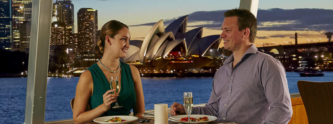 Captain Cook Cruises Sunset Dinner is an approximately 1 ½ hour cruise of Sydney Harbour. Visitors will have the opportunity to dine on Sydney Harbour and experience all the colour of autumn and spring sunsets, winter twilight or the endless days of summer on the Sunset Dinner Cruise. The evening starts with a glass of sparkling wine and a mezze plate to share, followed by a choice of mains and desserts, with wine and beer included.