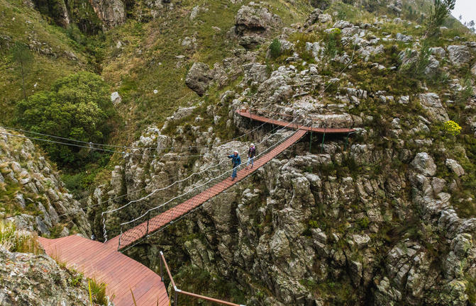 Once in the mountains, soar through eleven thrilling ziplines, some over 300 metres long, each ending on cliffside platforms above the Riviersonderend Gorge. A highlight of the tour is crossing a suspension bridge over a narrow sandstone ravine above a double waterfall – a truly unforgettable experience.