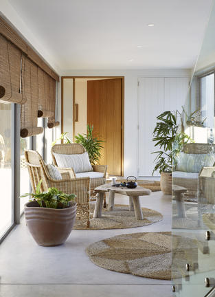 Mit Blick auf den Gartenhof mit einem ruhigen Wasserspiel.