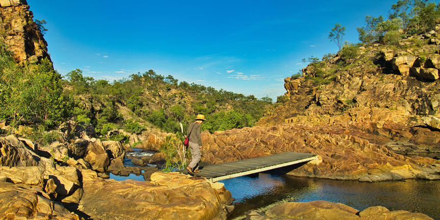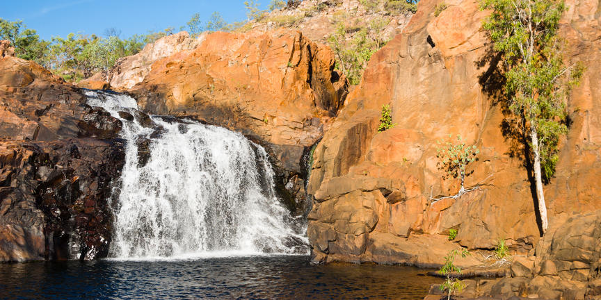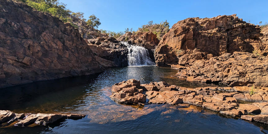 Under the harsh heat of the Northern Territory’s dry season, Leliyn—also known as Edith Falls—emerges as a chain of cool, shimmering pools in the heart of Nitmiluk National Park, around 60 kilometres north of Katherine. Fed by the Edith River, the water cascades over sandstone ledges framed by rugged cliffs and open woodland. Designated swimming areas invite visitors to wade into calm, refreshing depths, while walking trails lead along the river to elevated lookouts with views of the surrounding escarpment. Each pool has its own character, from shallow edges to deeper sections favoured by confident swimmers. Wildlife is part of the experience, with native birds and reptiles frequently spotted near the tracks. Camping and picnic facilities are available near the main pool, with amenities including shaded areas, barbeques, and access to walking routes.