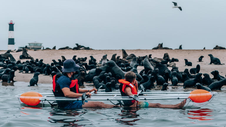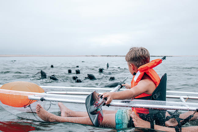 Per la prima volta nel nostro Paese, gli ospiti possono ora esplorare la costa mozzafiato di Pelican Point con i nostri kayak trasparenti e cristallini. Questi kayak all'avanguardia offrono un'esperienza indimenticabile, permettendo agli ospiti di scivolare senza sforzo sulle acque e di godere di una vista unica della vita marina sottostante. Seguendo lo stesso itinerario dei kayak rossi, questi kayak di cristallo permettono agli ospiti di immergersi completamente nell'ambiente circostante. Con le foche curiose che si avvicinano per essere ispezionate, gli ospiti possono divertirsi a studiarle mentre nuotano sotto il loro kayak, mentre alcune nuotano fino al fondo del kayak.