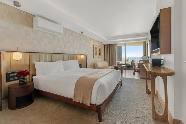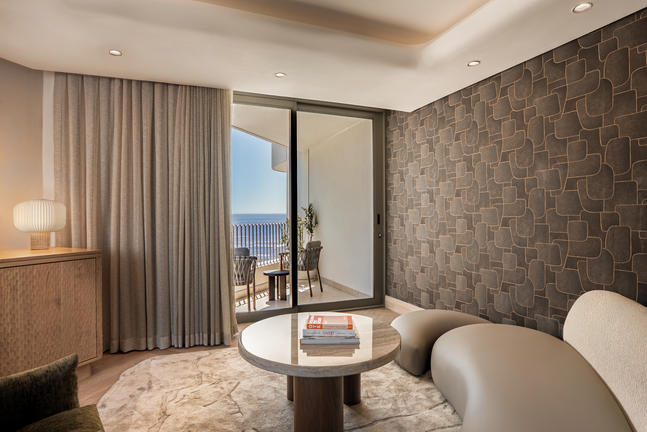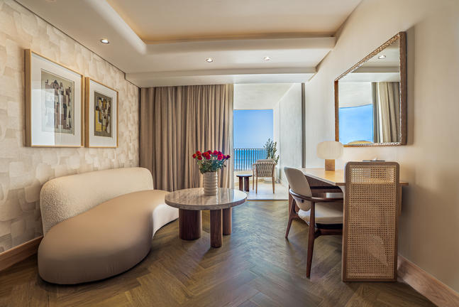 These Classic Sea-Facing Rooms combine comfort with serene design. Each features a private balcony with a partial sea view, rain shower, Nespresso machine, refreshment station, smart TV, and Marshall music speaker. Plush linens, Kove Collection’s signature “Echo” amenities and thoughtful details ensure a peaceful stay by the ocean.