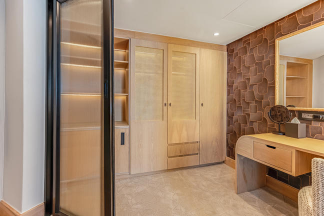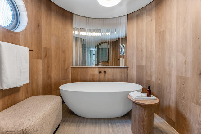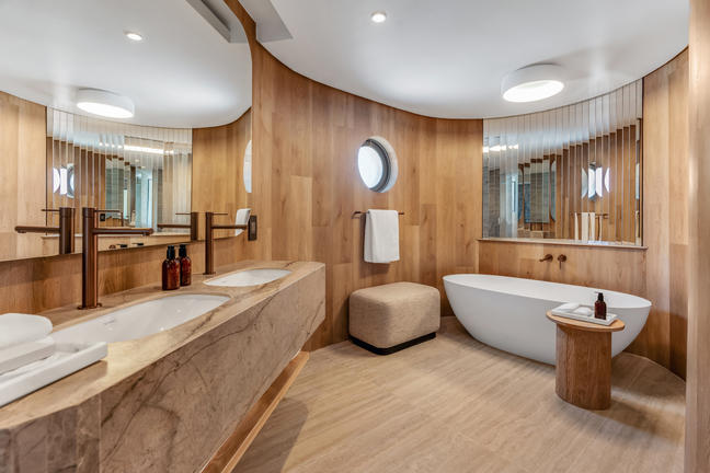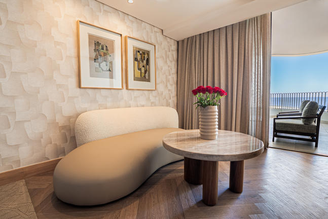 Our spacious Sea-Facing Suites feature a separate dressing room, an expansive bedroom and lounge area, and a luxurious bathroom with both a deep soaking bath and rain shower. Step out onto your private balcony to admire uninterrupted ocean views. Each suite is equipped with a Nespresso machine, refreshment station, smart TV, and a Marshall music speaker. Soft, luxurious linens, Kove Collection’s signature “Echo” amenities and double vanities complete this refined coastal retreat.