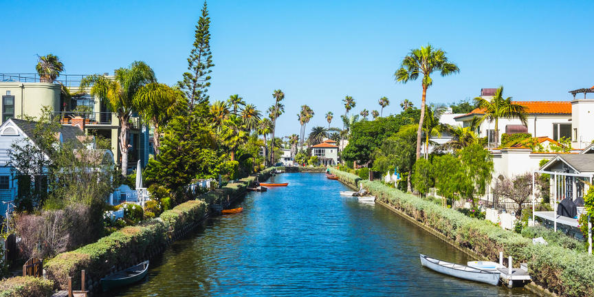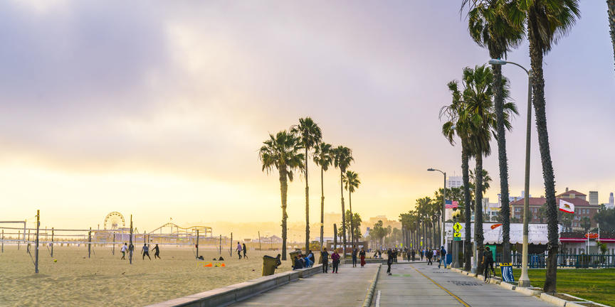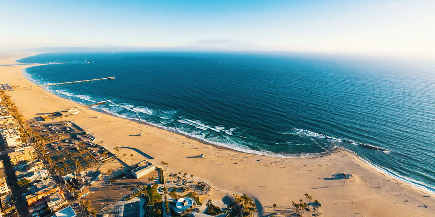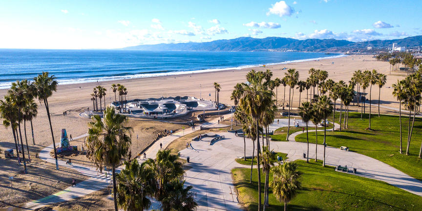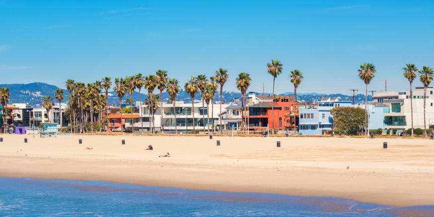 K Los Angeles patří i pláže a pobřežní města. Oblíbenou Venice Beach s pěší zónou Ocean Front Walk zahltí ve dne davy plážového lidu a rekreantů na kolečkových bruslích. Mezi obchůdky se suvenýry, obrazy, keramikou a kavárnami vyhrávají osamělí saxofonisté a kytaristé. Procházku zpestří polykač ohně a dokonce zde vystupoval i žonglér s motorovými pilami. Uvidíme tady zasněné dívky opřené o plot posilovny, kde přímo pod širákem pohazují horami vypracovaného masa opálení svalovci. A také potkáme černé hochy z ulice, jak prohánějí basketbalovou mičudu na asfaltových hřištích, kde se natáčel film „Bílí muži neumějí skákat“. Po setmění obsadí korzo pouliční gangy a prodejci drog a případnou večerní procházkou si výletníci koledují o malér. Zbytek čtvrti Venice Beach zvoří zástavba luxusních domů kolem protáhlých ramen kanálů. Ty jsou ostatně jedinou připomínkou utopického projektu Abbotta Kinneyho, který zde v roce 1905 budoval kalifornské Benátky, pročež dokonce přivezl z Itálie i několik gondol.