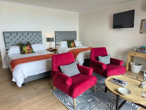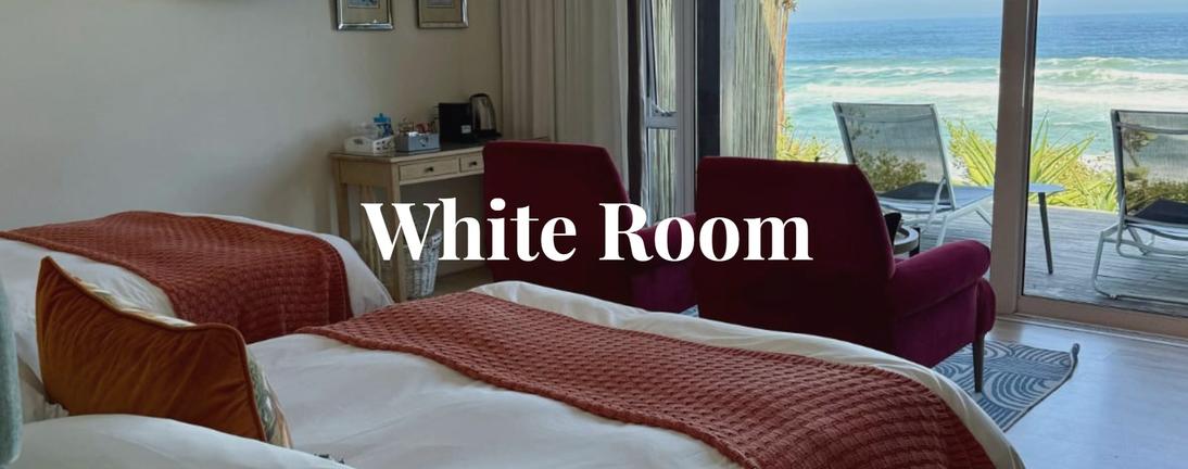 The White Room is a spacious air-conditioned 42sqm seafacing room on the ground floor with beach front views and private deck. The room has two double beds and is en-suite bathroom with bath and shower. Free WiFi, DSTV, coffee/tea facilities, Nespresso