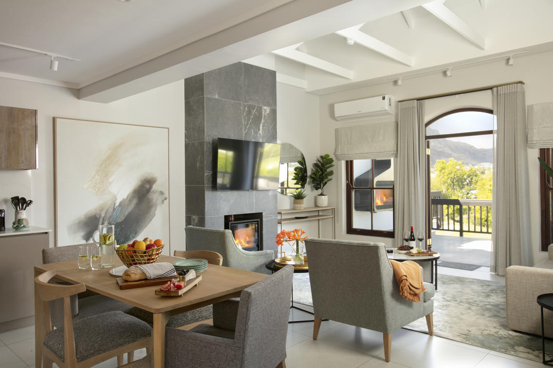 Suite a pianta aperta con letto king size, divano letto per due bambini sotto i 12 anni, bagno privato, area salotto, cucina completamente attrezzata, lavatrice, asciugatrice, lavastoviglie e vista sul campo da golf e sulle montagne. Il letto matrimoniale è convertibile in due letti singoli. La suite è prenotata in modalità self-catering, colazione esclusa, ma può essere aggiunta separatamente.