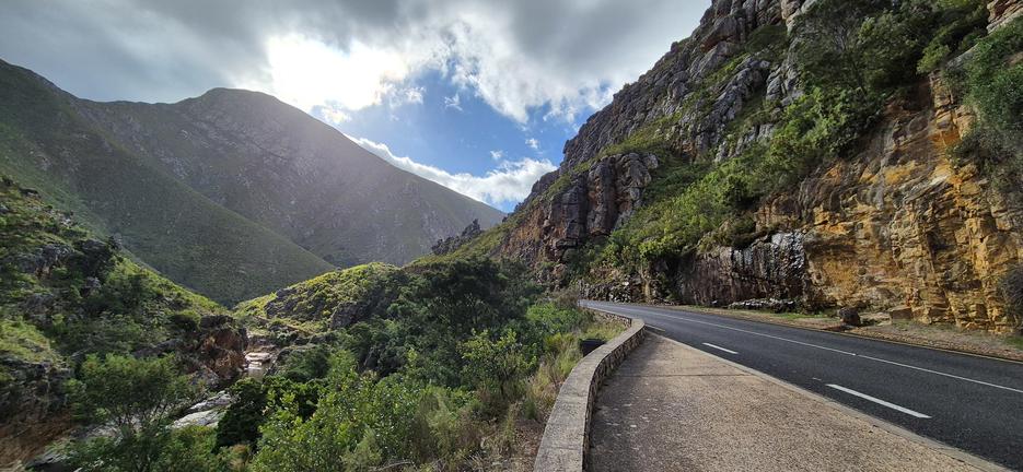 The scenic Tradouw Pass connects the Overberg and Klein Karoo regions of the Western Cape via the Langeberg Mountains. The spectacular road and pass, which took four years to build, is renowned for its wild flowers in the spring, clusters of blazing red aloes in late autumn, breathtaking waterfalls in the winter and magnificent swimming pools in summer.