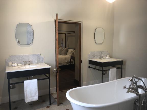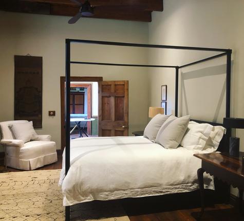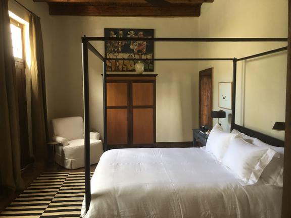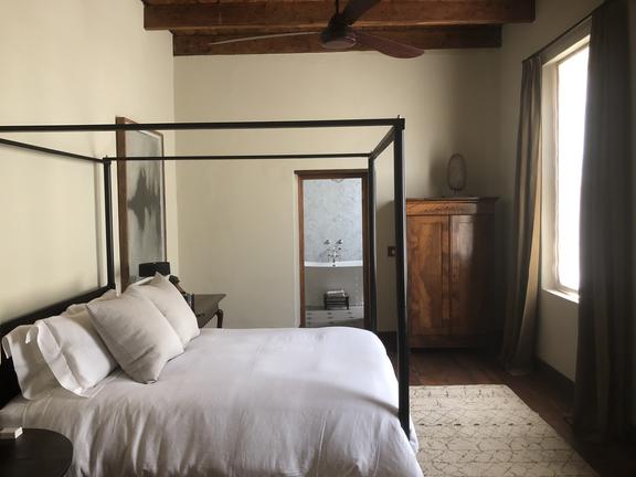 Einzelbetten als Kingsize-Bett mit eigenem Bad mit Blick auf den Garten. Das Badezimmer verfügt über eine Dusche und eine Badewanne sowie zwei Waschbecken sowie eine Fußbodenheizung für die Wintermonate. Eine sehr gemütliche und ruhige Suite mit großzügigen Sitzbereichen und einem großen eigenen Badezimmer mit Blick auf den Innenhof und den Zitrusgarten im Topf.