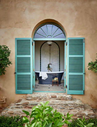 Luxuriöses Schlafzimmer mit großem eigenem Bad mit Dusche, Badewanne, zwei Waschbecken und Fußbodenheizung. Dieses Badezimmer hat Doppeltüren, die auf die Terrasse führen und einen Blick auf den privaten Garten bieten. Eine wundervolle, sonnige Suite mit einem schönen antiken Kleiderschrank. Das Queensize-Bett kann nicht geteilt werden, aber wir können zwei Bettdecken zur Verfügung stellen.