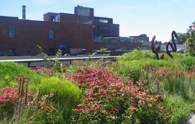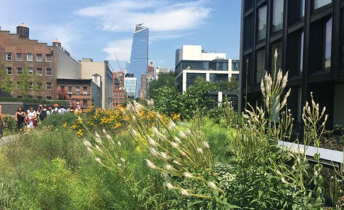 The High Line en la ciudad de Nueva York es un parque lineal elevado de 1.45 millas de largo situado en el lado oeste de Manhattan. La zona era originalmente una vía de ferrocarril que finalmente se transformó en uno de los parques más singulares de la ciudad de Nueva York, ofreciendo un parque de recreo urbano con flores silvestres, vegetación, instalaciones de arte al aire libre y vistas increíbles de la ciudad.
