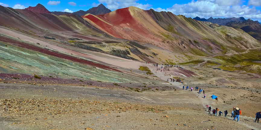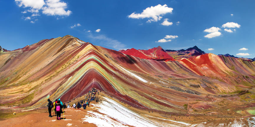 Nápadně barevná duhová hora Vinicunca, která se nachází v blízkosti velké hory Asungate v oblíbené peruánské oblasti Cusco, dosahuje výšky 5200 m a představuje přirozenou kaleidoskopickou paletu barev, která se nepodobá ničemu jinému na Zemi. Tato impozantní geologická formace, známá také jako ‚Mountain of 7 Colours‘, byla podle National Geographic nepřekvapivě zařazena mezi 100 nejlepších míst k návštěvě, než zemřete. Hory jsou skryté v odlehlé části peruánských And a lze se k nim dostat pouze dlouhým jednodenním výletem z Cusca nebo v rámci treku Ausangate. Ti, kteří se budou snažit dostat do hor, budou bohatě odměněni vynikajícími turistickými stezkami, velkolepou přírodní scenérií a příležitostí k interakci s místními vesničany, z nichž většina i nadále žije tradičním životem jako pastevci alpak a farmáři.
