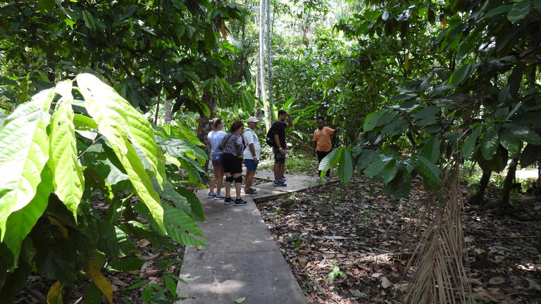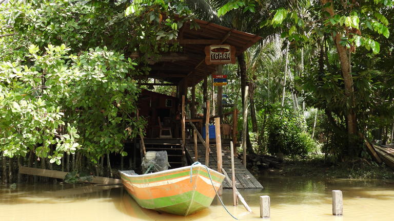 A full day of experiences awaits as travelers explore riverine culture and local cuisine while navigating streams and swimming in the river. Visit the Casa do Chocolate to learn about organic cacao farming and Dona Nena's entrepreneurial journey, enjoying hot chocolate, forest brigadeiro, specialty coffee, and Filha do Combu chocolate bars. Next, at Eco Restaurante Saldosa Maloca, discover sustainability projects that conserve the forest, particularly focusing on the açaí supply chain, and enjoy fresh açaí with protein and cassava flour, followed by lunch. The journey continues to Igarapé Periquitaquara and the Canto dos Pássaros restaurant, where guests can take a refreshing swim and conclude with a traditional river snack of coffee with tapioca.