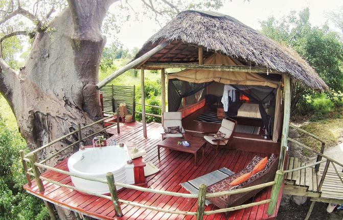 The Honeymoon Safari Tent is built around an ancient big Baobab Tree overlooking the Tarangire River. It has a King Bed with a comfortable mattress. There is an indoor bathroom with a toilet, shower & basin. The outside deck boasts an amazing outdoor shower and bath, which enhances the romantic setting of this tent.