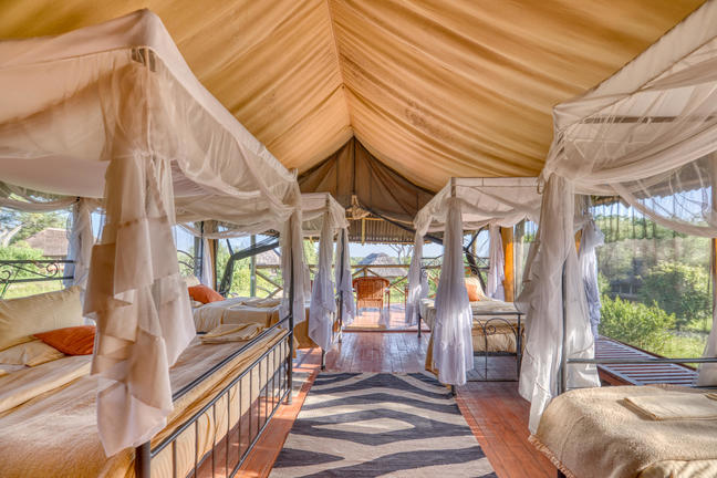 Traditional grass thatching adorns the roof of the main lodge structure, which is set off the ground on an elevated deck. The breezy lounge boasts ample seating in a relaxing open-air environment. The dining area, where culturally inspiring meals are served, consists of simple safari style seating and the elevated position allows for excellent views over the riverbank below. Both the dining and lounge areas are married into a proper bon-fire area and game viewing deck that also overlook the same stunning views. The lodge’s small, informal gift shop offers the families of the nearby Maasai villages a chance to sell some of their handmade wares.