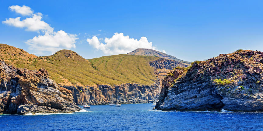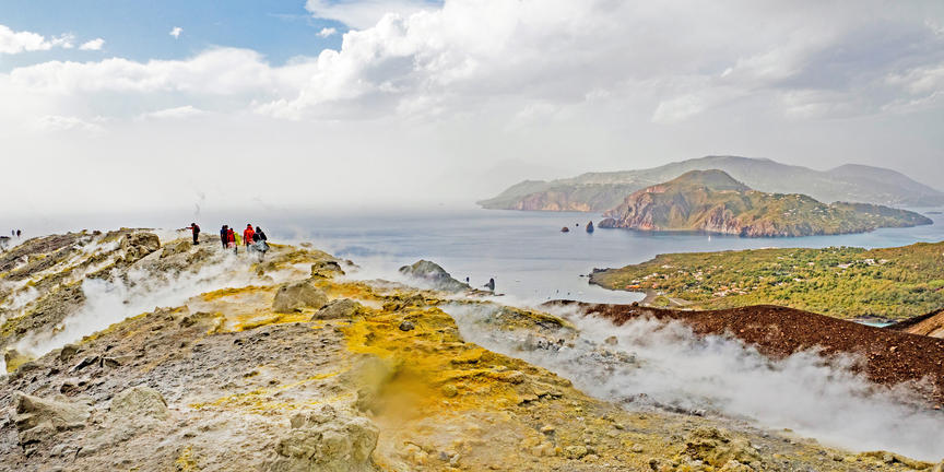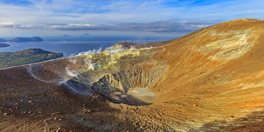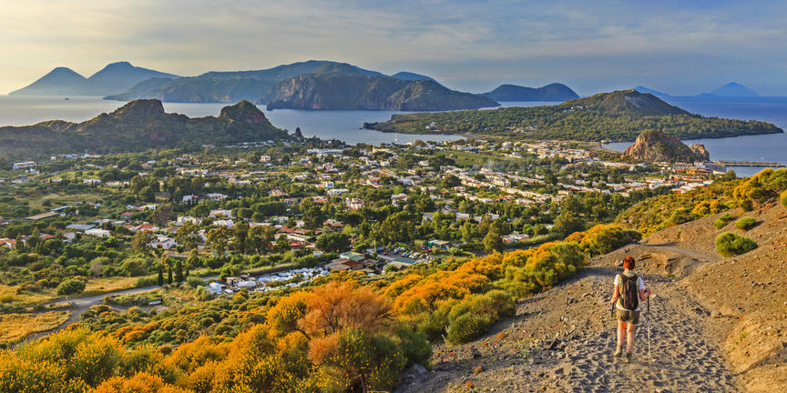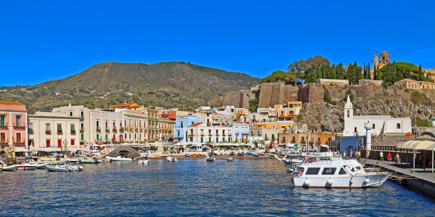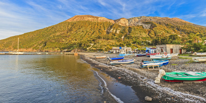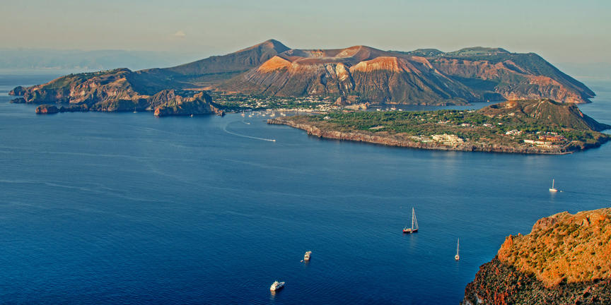 Das kleine Stadtzentrum von Vulcano Island, das vom rauchenden Gipfel eines schwefelhaltigen Vulkans überragt wird, liegt am Ufer eines strahlend blauen Meeres und verfügt über kleine Straßen mit Restaurants, Unterkünften, Minimärkten, Souvenirläden und einem geschäftigen Hafen. Die Insel genießt eine günstige Lage als die dem sizilianischen Festland am nächsten gelegene der sieben Äolischen Inseln.