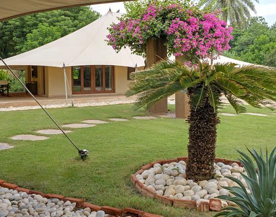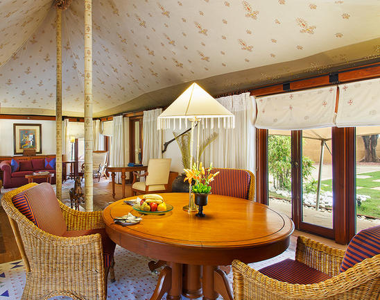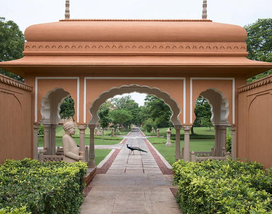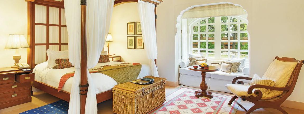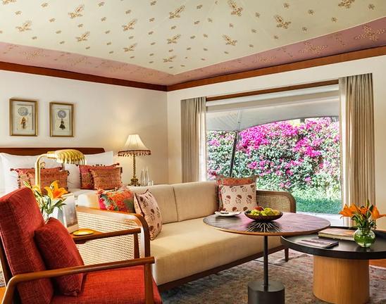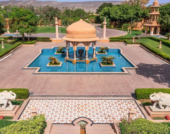 The Oberoi Rajvilas is a luxury resort located on Goner Road, just outside central Jaipur, Rajasthan. Nearby attractions include Amber Fort, Hawa Mahal, City Palace, Nahargarh Fort and Jaigarh Fort, all celebrated for their architectural grandeur. Guest rooms feature a four-poster bed, sunken marble bathtub, private garden or pool, walk-in wardrobe and elegant natural décor. Guests may dine at Surya Mahal for international cuisine, Raj Mahal for refined Indian dishes, or enjoy the Rajwada Library Bar. Facilities include a spa with traditional therapies, a temperature-controlled swimming pool, fitness centre, landscaped gardens and curated cultural experiences, ensuring a tranquil yet immersive stay.