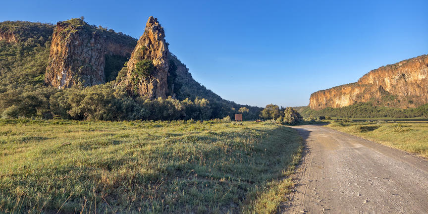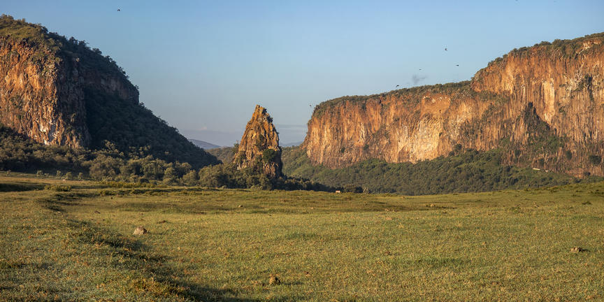 Located northwest of Nairobi, south of Lake Naivasha, Hell's Gate National Park gets its name from its pair of massive red tinged cliffs which frame its natural hot geysers. The spectacular scenery, complete with rock towers, volcanoes, and geysers with plumes of geothermal steam, is dominated by these sheer cliffs. Visitors can look forward to a wide variety of activities such as: biking through this beautiful landscape, exploring the Njorowa Gorges, discovering two extinct volcanoes – Olkaira and Hobley’s, and camping under the sparkling Kenyan night sky. Popular activities include: walking safaris, mountain biking, rock climbing, hiking and game viewing. Commonly spotted wildlife include: giraffe, zebra, eland, gazelle, buffalo, zebras, hartebeests, baboons and over 100 bird species.