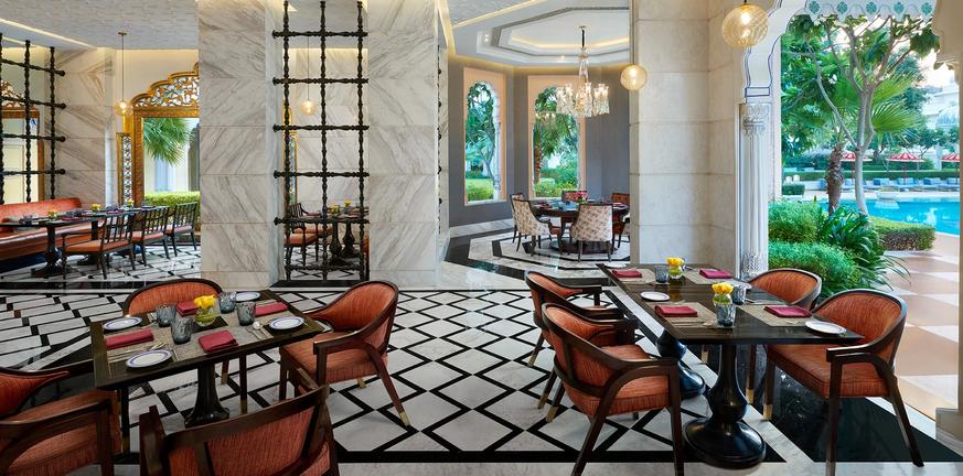 The Leela Palace Jaipur, located amidst the serene Aravalli hills near the bustling city of Jaipur, is a luxurious retreat that blends Rajputana and Mughal grandeur with modern comfort. Guests can choose from opulent rooms, suites, and villas featuring plush interiors, private courtyards, marble bathrooms, and elegant décor that reflects Rajasthan’s regal heritage. Dining options include gourmet restaurants offering authentic Rajasthani flavours and international cuisine, complemented by enchanting al fresco settings under starlit skies. Beyond its accommodations and dining, the palace offers world-class facilities such as a tranquil spa, a swimming pool, and grand venues for celebrations and conferences, making it a sanctuary of timeless Indian luxury.