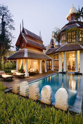 Our most exclusive residence offers the ultimate in luxury and privacy. Situated behind high walls, this magnificent complex features six private Lanna-style pavilions with three king-sized beds and three twin bedrooms as well as numerous sitting and dining rooms, open-air salas, and a private lounge with grand piano and bar. Connected by walkways, each pavilion is unique in design, inspired by a mix of northern Thai and Royal Lanna architecture. In addition to its individual sleeping pavilions, the Royal Residence boasts three luxurious swimming pools, private Jacuzzis and saunas, all set right on the edge of the compound’s own free-form lotus pond and surrounded by towering rain trees, fragrant frangipanis and a wall of life-sized elephant sculptures drawn from Chiang Mai’s oldest temple, Wat Chiang Man.