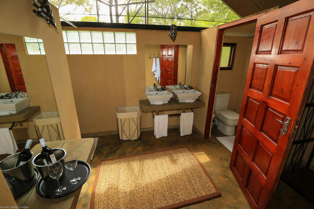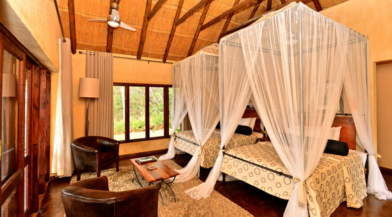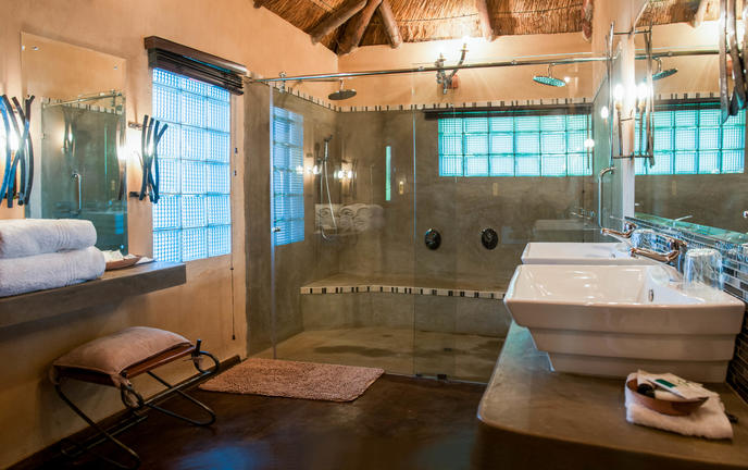 60 m sq with thatched roof and natural stone walls. Veranda overlooking the gorge, king-size bed, overhead fan, mini bar, small seating area, en suite bathroom with double shower, double basin and toilet. Mains electricity with backup generator.