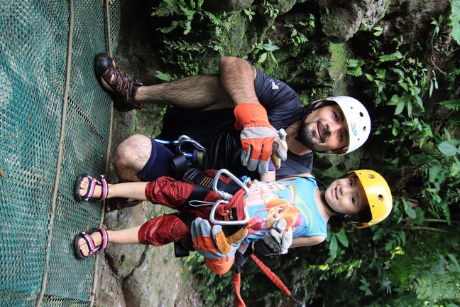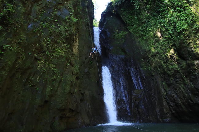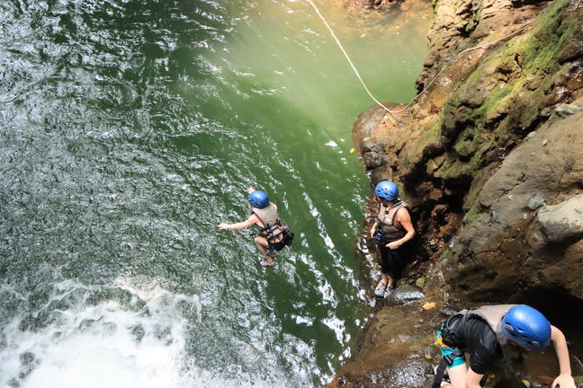 First rappel – 35 meters down to a 5-meter-deep natural pool.