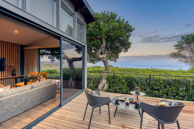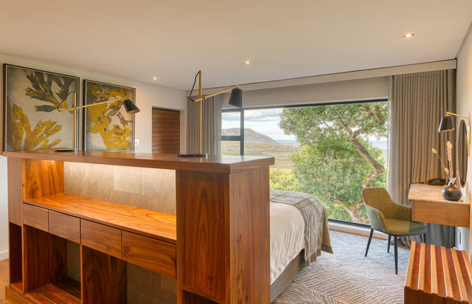 Suite features a spacious bedroom with en-suite bathroom, separate lounge with tea & coffee making facilities, minibar, cosy fireplace, DVD player for in-room entertainment. The spacious suites open out onto a private outside deck overlooking the Walker Bay. As with all One-Bedroom Luxury Suites at Garden Lodge, facilities such as a separate bath, shower and toilet, satellite TV and secure room safes are standard.