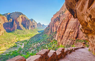 Situé dans le sud-ouest de l’État, en plein cœur du désert, il surprend par sa végétation luxuriante, ses vallées verdoyantes, et ses falaises s’élevant à 305m, renommées par les pionniers du XIXᵉ siècle : Angel’s Landing, The Three Patriarchs, West Temple ou encore Great White Throne . Ici, la nature a façonné pendant des millions d’années un décor grandiose où se mêlent rochers rougeâtres, crèmes et dorés, ciel azur et eaux émeraude.