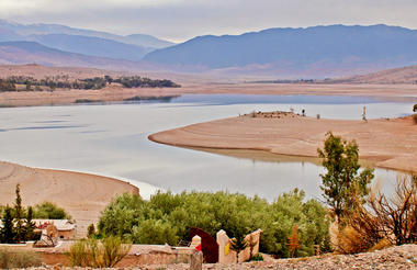 The Agafay desert is located thirty kilometers south of Marrakech and extends over several hundred acres. This rocky desert can be likened to a sand desert. Indeed, its white dunes and landscape are similar to the Sahara dunes. In the middle of the desert, is a surprising oasis, a haven of peace and tranquility, where the fauna and flora can easily develop. In this paradise, frogs and turtles live peacefully in the oueds, surrounded by water and rocks. Lost in the dunes are still some Berber villages that continue to exist in this austere but sublime nature.