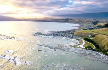 - Kaikoura se extiende a lo largo de una pequeña península habitada por focas, entre el mar y las montañas. Fue afectada por un terremoto en 2016 y aún conserva huellas de estos cambios geológicos. La ciudad también es conocida por las ballenas y cachalotes que frecuentan sus aguas durante todo el año, los cuales se pueden observar en cruceros que salen varias veces al día.