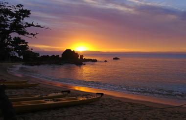 Tilbake ved lodgen er det tid for å nyte solnedgangen på stranden før middagen serveres i strandhuset.