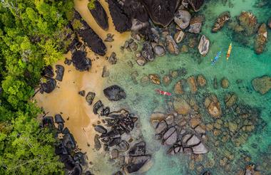 Etter nok en fantastisk frokost på sjødekket, er det klart for oppdagelsesferd med kajakk. Krystallklart vann og de fantastiske fjellformasjonene ved Tampolo-odden venter dere. Etter hvert blir det landgang ved «Sacred Island» og tid for litt bading. Deretter padler dere inn i en uberørt mangrove- og skogkledd elv, og er dere heldige møter dere blåflekkete piggrokker i det grunne vannet og bambus-lemurer som krysser elven. Etter en piknik-lunsj på stranden, returnerer dere til lodgen. Det er klart for en kveld med underholdning og godt humør med besøk av den madagassiske musikk- og dansegruppen fra den lokale landsbyen. Nyt solnedgangen rundt bålet på stranden før den siste middagen i Masoala.