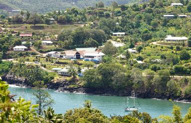 Velkomst og transfer til hotellet med panoramaudsigt over Atuona-bugten.
