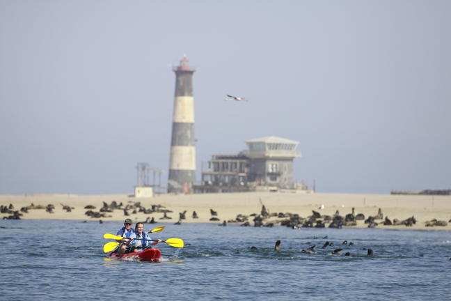 Planing catamaran transfer to Pelican Point. Kayaking amongst the seals. Light brunch. 4x4 dune transfer back to Walvis Bay Waterfront. Seals looking at you, so close you might forget you are on a kayak. The most amazing experience combining boat, kayak, and 4x4. Start with a “first on the water” planing catamaran transfer to Pelican Point Peninsula. Land on an empty beach with your waiting guides. Join the seals and wildlife from your kayak. Enjoy the hot refreshments and food before taking a 4x4 drive back across the peninsula.