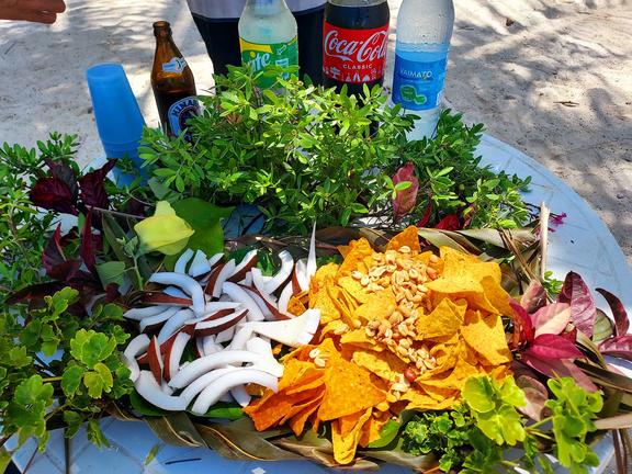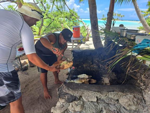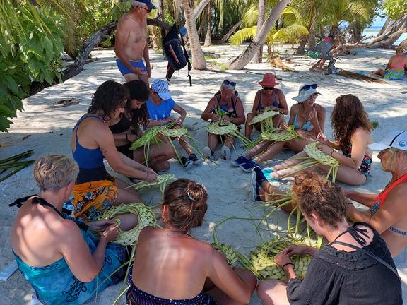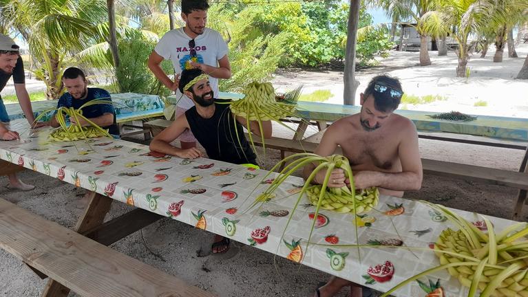 Zur Mittagszeit, zwischen 12:15 und 13:15 Uhr, erwartet Sie auf einem abgelegenen Motu ein Aperitif und ein köstliches Picknick im traditionellen Stil, reich an lokalen Spezialitäten mit frischem Fisch. Nach dem Essen erleben Sie eine Vorführung der polynesischen Kunst des Kokospalmblatt-Flechtens – ein stiller Dialog zwischen Handwerk, Natur und Tradition.