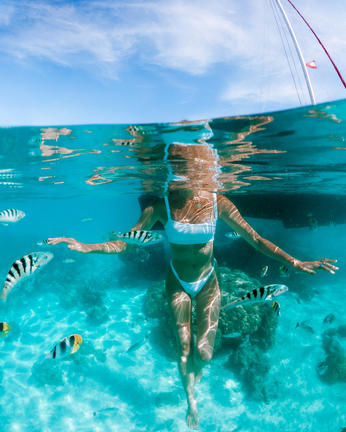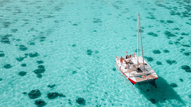 Lassen Sie sich vom Zauber des späten Nachmittags tragen, während Sie sanft über die türkisfarbene Lagune von Moorea segeln. An Bord der charmanten Katamaran Taboo, gestaltet im traditionellen polynesischen Stil, genießen Sie eine entspannte und zugleich intime Atmosphäre – perfekt, um den Tag harmonisch ausklingen zu lassen.
