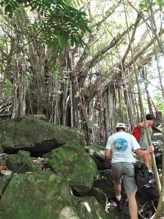 Der Weg führt dich zum Fuße von Mount Otemanu und Mount Pahi, wo sich – verborgen zwischen riesigen Wurzeln und grünem Blätterdach – ein beeindruckender, uralter Banyanbaum erhebt.