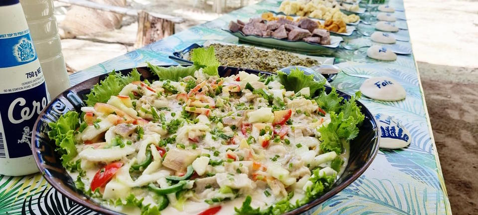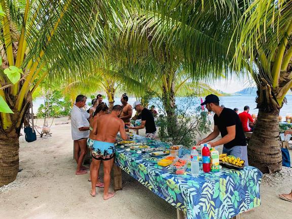 Anschließend gleiten Sie zu einem privaten Motu, einer kleinen Insel wie aus einer anderen Welt. Dort erwartet Sie ein liebevoll zubereitetes vegetarisches Festmahl aus lokalen Spezialitäten: zarte Gemüse in cremiger Kokosmilch nach Art des tahitianischen Rohfischgerichts, „Fafa“ – der aromatische Inselspinat –, Tofu sanft in Kokosmilch geschmort, dazu Taro, Süßkartoffeln, Uru (Brotfrucht), je nach Saison die leuchtenden Fe‘i-Bananen, das traditionelle Dessert Po‘e und frische, sonnengereifte Früchte. Ein Mahl, das nicht nur sättigt, sondern die Seele berührt.