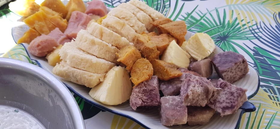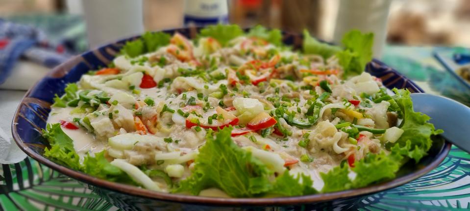 - (roher Fisch, gegrilltes Hähnchen, Reissalat, gemischter Salat, Inselobst / Softdrinks, Punch, Bier, Wasser, Saft)