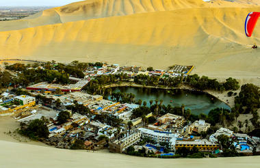 Huacachina, es un oasis rodeado de las dunas del desierto. Este pequeño paraíso ofrece abundante vegetación de palmeras, eucaliptos y guarangos que brindan descanso a las aves migratorias, siendo el destino uno de los lugares más bellos de la costa peruana. Es ideal para practicar deportes de aventura.