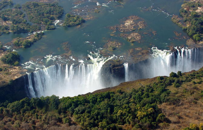 Known locally as Mosi-oa-Tunya—“The Smoke That Thunders”—Victoria Falls is one of the world’s great natural landmarks. Straddling the Zambezi River between Zambia and Zimbabwe, it forms a vast curtain of water that fills the air with mist and sound. The Zimbabwean side grants the most dramatic views, where mist rises like ghostly curtains and rainbows arc through the spray. Measuring about 1,708 metres across, it is regarded as the largest single continuous sheet of falling water on Earth. The adjacent town of Victoria Falls provides a convenient base for exploring the region, with a wide range of activities from scenic flights and microlight trips to white-water rafting, bungee jumping, kayaking, and safaris into Chobe National Park.