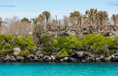Resting approximately 12 kilometres southeast of Santa Cruz, the relatively small island of Santa Fe is one of the oldest islands in the Galapagos archipelago with rock formations below the water’s surface dating back almost four million years. The island is best known for its endemic Barrington Land Iguana as well as its towering prickly pear cacti which have been known to reach remarkable heights of up to 20 feet. The magnificent Barrington Bay is the only visitor site on the island. There are two hiking trails that start here. One leads to a scenic viewpoint atop a cliff and the other wends through a forest of gigantic opuntia cacti. The beach is popular with sea lions and is an excellent spot from which to snorkel the radiant blue-green waters. You may even spot a Galapagos green turtle gracefully swimming by.