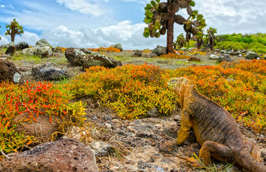A small, vibrant jewel in the Galápagos archipelago, South Plaza Island is a striking study in contrasts. Its rugged cliffs rise sharply from turquoise waters, while the interior is carpeted with bright orange and green sesuvium plants, creating a kaleidoscope of colours. The island teems with life: colonies of sea lions lounge lazily on sun-warmed rocks, swallow-tailed gulls wheel overhead, and striking land iguanas patrol the sunbaked terrain. Visitors can wander along narrow trails that weave through dramatic cliffs and cactus-studded landscapes, or snorkel in the surrounding waters, where playful fish dart among the waves. The salty tang of the ocean blends with the hum of seabird colonies, offering an intimate sensory experience with one of the Galápagos’ most vibrant and unique islands.