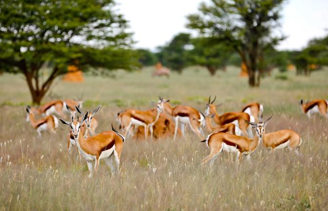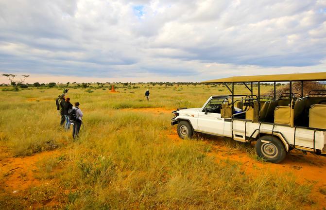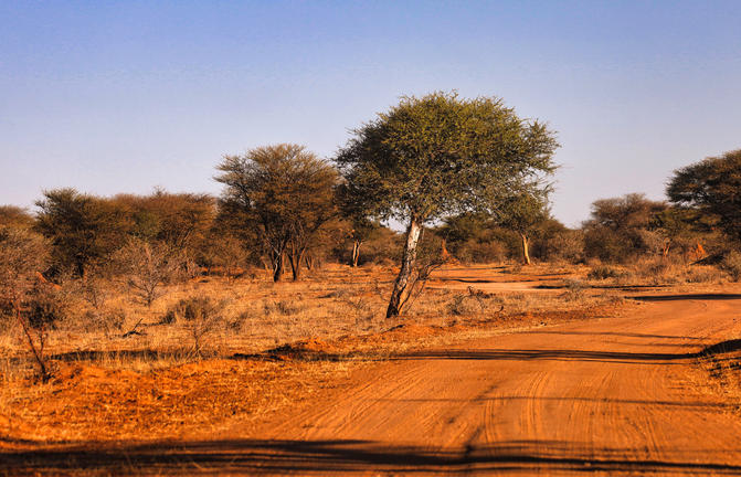 Spreading across Botswana, South Africa and Namibia, the Kalahari meaning 'the great thirst' is an exceptionally beautiful living desert. The landscape is characterised by a large semi-arid sandy savannah draped over a gently rolling inland sea of sand covering most of Botswana and large parts of Namibia and South Africa. It is also the last bastion of the indigenous San people with the modern world having enveloped all the other areas they once roamed. The Namibian portion is made up of red sands covered in thin, wispy, mostly golden grass and dotted with acacia trees and wide-ranging wildlife including gemsbok, impala, jackals and cheetah.