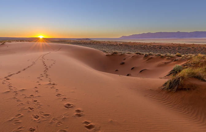Spreading across Botswana, South Africa and Namibia, the Kalahari meaning 'the great thirst' is an exceptionally beautiful living desert. The landscape is characterised by a large semi-arid sandy savannah draped over a gently rolling inland sea of sand covering most of Botswana and large parts of Namibia and South Africa. It is also the last bastion of the indigenous San people with the modern world having enveloped all the other areas they once roamed. The Namibian portion is made up of red sands covered in thin, wispy, mostly golden grass and dotted with acacia trees and wide-ranging wildlife including gemsbok, impala, jackals and cheetah.