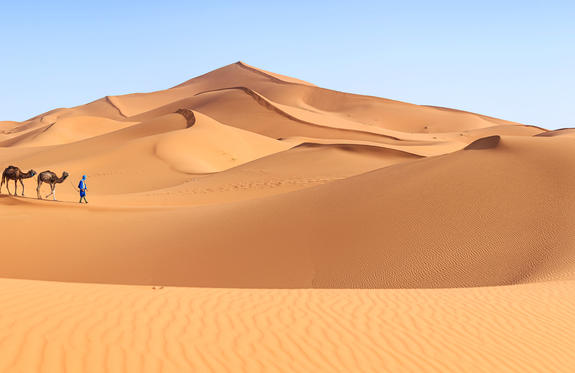 Situated in the vast desert region of Saharan Morocco, dividing Morocco and Algeria, Erg Chebbi is one of two Moroccan ‘ergs’, which are a sea of dunes. What it lacks in size - compared to the deserts of Algeria, Libya and Namibia - it makes up for in its extraordinarily scenic golden landscape, which changes colours dramatically at sunset. The dunes of Erg Chebbi span over 30 kilometres and rise up to 160 metres. From Merzouga, the tourist centre, take a camel trip into the wild; enjoy quad biking; or stay overnight in a desert oasis called a Moroccan bivouac.