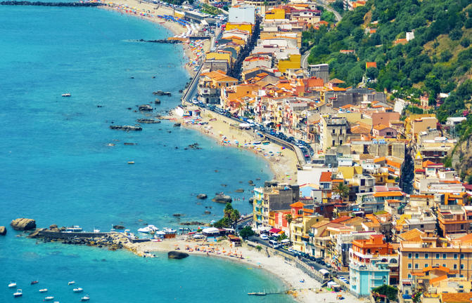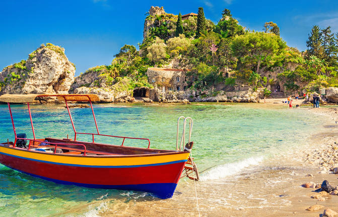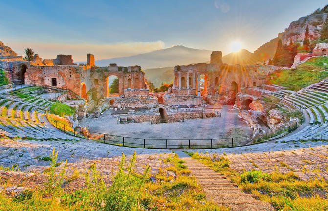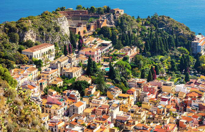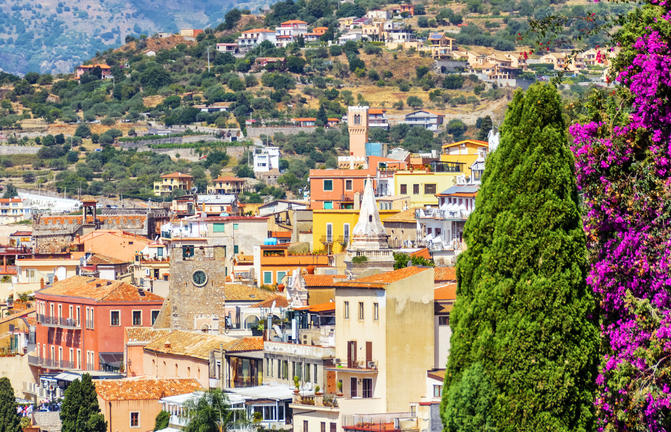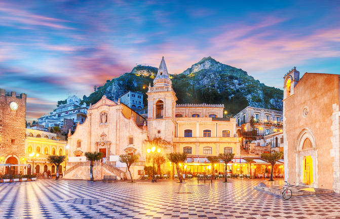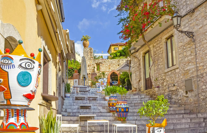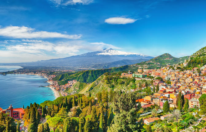 Taormine bénéficie d'un emplacement idyllique, idéalement perché sur un flanc de montagne escarpé offrant une vue panoramique sur l'Etna, deux grandes baies et un amphithéâtre gréco-romain pittoresque. Baignée de soleil toute l'année, cette station balnéaire chic attire un flot constant de célébrités et de vedettes en vacances. Malgré son atmosphère touristique, sa beauté naturelle est indéniable. Le réseau chaotique de rues sinueuses de la ville est parsemé de boutiques de créateurs de luxe, d'anciennes églises et de balcons fleuris ornant des bâtiments médiévaux magnifiquement restaurés et des places intimes. Taormine est particulièrement magnifique par temps clair, lorsque vous pouvez admirer la flore et la flore exquises sur fond de volcans enneigés crachant des bouffées de fumée blanche dans un ciel bleu envoûtant. N'oubliez pas de passer un après-midi à pique-niquer dans le magnifique parc Giovanni Colonna.
